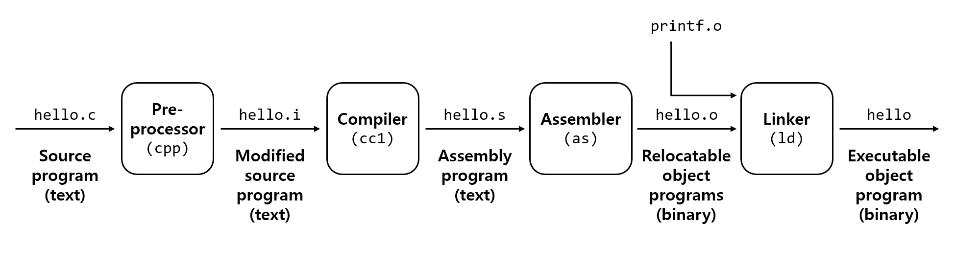 - 전처리기, 컴파일러, 어셈블러, 링커의 4단계를 실행하는 프로그램드을 합쳐서 컴파일 시스템이라고 함.