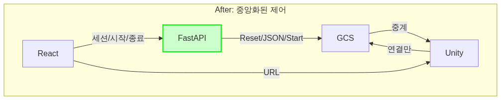 | 제어 주체 | 3곳 분산 | FastAPI 중심 |