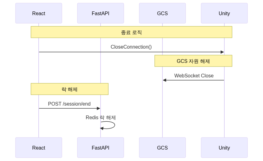 종료 로직에서도 비슷합니다. GCS 자원을 해제하는 건 Unity를 통하고, 락을 해제하는 건 FastAPI를 통합니다.